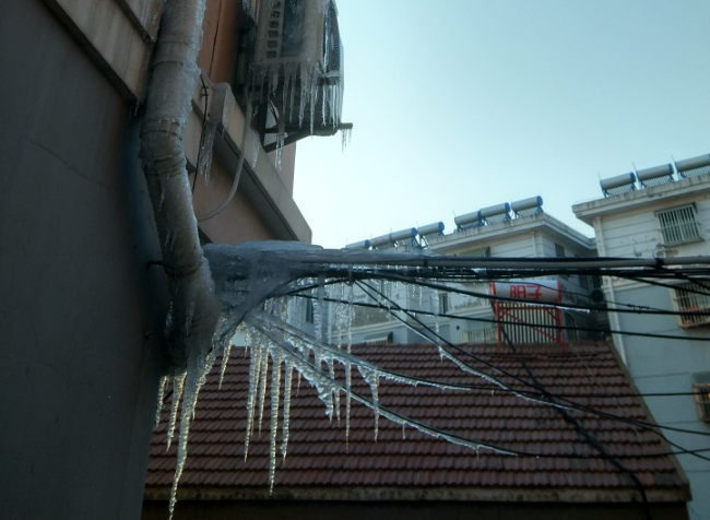 2月4日下午,淮海農(nóng)場(chǎng)城南15號(hào)樓樓頂出現(xiàn)自來(lái)水泄漏現(xiàn)象,泄漏下來(lái)的水流不僅把二樓墻壁上的空調(diào)凍成了冰凌團(tuán)子,漏下來(lái)的水沿著水管四濺,造成二樓的主樓梯口成了水簾洞,臺(tái)階也成了易滑跟頭的冰臺(tái)階。無(wú)論是空調(diào)還是冰臺(tái)階甚至高懸在頭頂?shù)谋瑁即嬗袠O大的安全隱患。