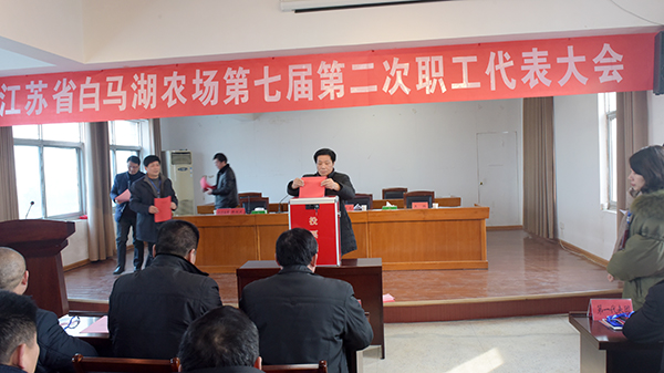 在大會(huì)預(yù)備會(huì)議通報(bào)參會(huì)人數(shù)、通過(guò)大會(huì)議程后,大會(huì)在莊嚴(yán)的國(guó)歌聲中宣告開(kāi)幕,黨委書(shū)記、場(chǎng)長(zhǎng)姚春華作了《關(guān)于江蘇省國(guó)營(yíng)白馬湖農(nóng)場(chǎng)公司制改革方案的說(shuō)明》,明確了改革的目的和在國(guó)有資產(chǎn)處置、法人治理結(jié)構(gòu)、組織領(lǐng)導(dǎo)、進(jìn)度安排等方面的具體要求和措施,有效地提高了代表們對(duì)農(nóng)場(chǎng)公司制改革的認(rèn)識(shí)和認(rèn)同。接著,大會(huì)又以舉手表決的形式,通過(guò)了職工董事、職工監(jiān)事選舉辦法,還按照規(guī)定程序和選舉辦法,分別通過(guò)票決、投票選舉和職工代表分別簽字等形式,順利通過(guò)了《關(guān)于江蘇省國(guó)營(yíng)白馬湖農(nóng)場(chǎng)公司制改革方案的決議》,選舉產(chǎn)生了一名職工董事和一名職工監(jiān)事。黨委副書(shū)記韓正光宣讀了大會(huì)決議,宣告農(nóng)場(chǎng)公司制改革方案順利獲得通過(guò)。