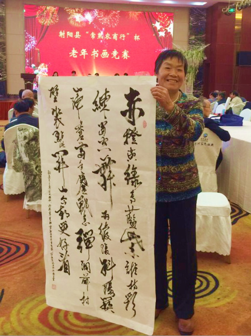 據(jù)了解,趙梅生原是江蘇農(nóng)墾淮海農(nóng)場石油機械廠的退休職工,她不但能寫一手瀟灑的字,而且小篆、隸書、楷書、草書等書法樣樣精通,家中存有一卷一卷的各類書法作品;經(jīng)她創(chuàng)作的人物肖像、山水畫、素描等作品,家中堆成了一摞一摞的。對特別鐘意、栩栩如生的繪畫,她總是裝裱起來,掛在大廳或是送給友人。無論是在上海普佗區(qū)陽光二居委書畫協(xié)會出版的《晚霞余輝》書畫作品選中,還是農(nóng)場書畫室陳列的精品展上,我們都可看到趙梅生的名字和熟悉的畫,沒有想到今年已是73歲的她,還能寫畫出如此逼真、如此飄曳的書法書畫,真是看了令人嘆為觀止。2016年7月,趙梅生書寫的小篆“勿忘抗日戰(zhàn)爭,頌揚民族精神,反對侵略占領(lǐng),維護(hù)世界和平”排在了拾貝軒網(wǎng)絡(luò)書法展第9名;同年10月,在射陽縣老齡協(xié)會、縣老齡辦聯(lián)合主辦的射陽縣“常熟農(nóng)商行”杯老年書畫競賽上,趙梅生的草書又獲得了二等獎;2017年在砥礪奮進(jìn)的江蘇農(nóng)墾書畫大賽上,趙梅生又以一幅山水畫、一幅草書獲得了江蘇農(nóng)墾“喜迎十九大和集團黨代會、喜慶江蘇農(nóng)墾成立65周年”書畫作品展優(yōu)秀作品。