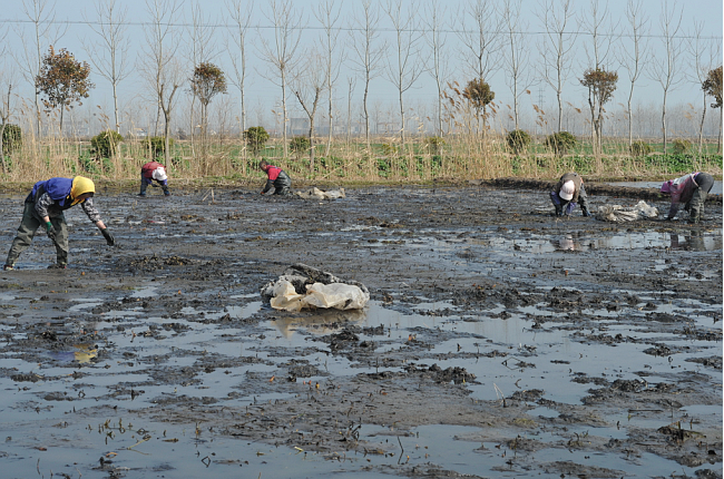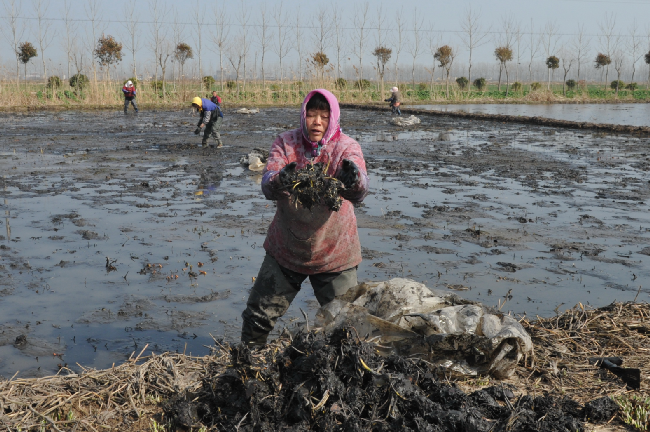 雖已初春,乍暖還寒。春節(jié)過后,淮海農(nóng)場愛蓮苑水生花卉基地里就是一派忙碌。每天,農(nóng)場下崗職工陸寶珍正常與其他10多名員工一起,頭戴著圍巾,穿著水褲,手持小鍬,拖著塑料薄膜,在睡蓮池中采摘睡蓮的根芽。等采集到一定量后,就按規(guī)格進(jìn)行分撿、計數(shù)打包,隨即按公司訂單需求,銷往全國各地甚至從海空渠道托運(yùn)到國外市場。