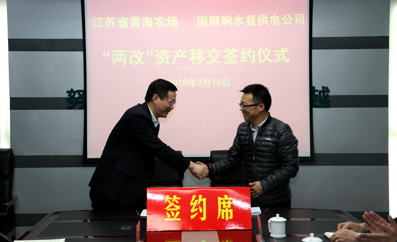 為貫徹落實國家和省委省政府及集團公司黨委關于加快推進農(nóng)場電力改造工作一系列決策部署,加快推進黃海電力“兩改”工作。3月15日,黃海農(nóng)場與國網(wǎng)響水縣供電公司電力“兩改”資產(chǎn)移交簽約儀式在響水縣供電公司舉行,標志著黃海電力“兩改”工作取得突破性的積極進展,進入職能接收、維修改造的實戰(zhàn)階段。黃海農(nóng)場黨委書記王亦勤、場長單祥忠、副場長薛亞林,響水供電公司黨委書記楊浩天、副總經(jīng)理沈曉東、王春雨共同出席簽約儀式。農(nóng)場和縣供電公司相關部室負責人參加了簽約儀式。