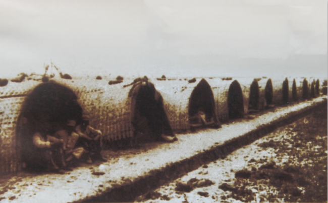開始,為了不給當地百姓增添太多的麻煩,每個戰士一天只有一壺水的定量飲水供應。師部以連、排為單位新挖了一些吃水塘,可滲出來的全是咸水。農業建設雖說參加的是一場沒有硝煙的戰斗,但有些困難實在不亞于真槍實彈。咸水,就是給他們的一種考驗。圖為將士們居住的簡陋蘆草席房,也稱百里連營。