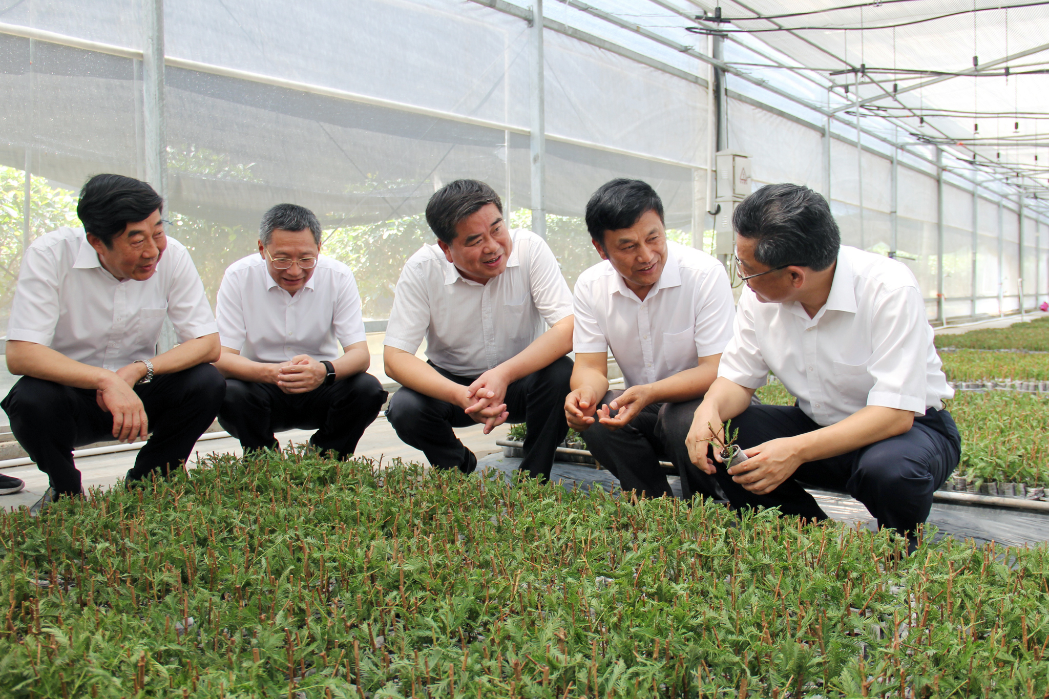 任振鶴一行首先察看了?港農場的展板介紹。當了解到農場實現(xiàn)糧食高產穩(wěn)產,水稻畝產達1300斤、小麥達1000斤后,任振鶴表示肯定。隨后,任振鶴走進?港農場有機農莊連棟大棚,詳細察看中山杉容器育苗和紅心火龍果種植。看到大棚里中山杉規(guī)格齊全,所育品種耐漬耐鹽、扦插成活率穩(wěn)定在70%以上,應時水果火龍果長勢喜人、豐收在望,市場前景比較好,任振鶴表示贊賞,并勉勵農場公司更加重視研發(fā),加快成果轉化,推動農業(yè)產業(yè)化。在聽取了?港農場黨委書記王世伯介紹的“常規(guī)農業(yè)高效化、高效農業(yè)規(guī)模化、有機農業(yè)特色化、林苗產業(yè)精品化”發(fā)展思路后,任振鶴頻頻點頭,對?港農場堅持有機農業(yè)20年,大力發(fā)展“三西”產業(yè)(西瓜、西蘭花、西紅花)的做法表示肯定。