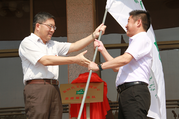 在揭牌授旗儀式上,姚準(zhǔn)明和董光威為新洋農(nóng)場新時(shí)代文明實(shí)踐中心揭牌。楊義林向新洋農(nóng)場有限公司黨委副書記、董事長、總經(jīng)理潘元海授新洋農(nóng)場志愿者服務(wù)總隊(duì)隊(duì)旗。新洋農(nóng)場有限公司黨委書記陳守軍致辭。