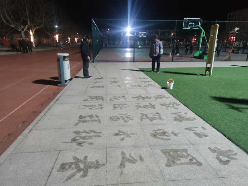 由于地面上的大理石成方成塊,這樣寫地書時剛好如同小時候我們臨摹稿紙上的一個個格子,一字一格,工整規范。又由于大理石平整光滑,便于筆在上面運行,用水做的墨跡也只是在上面停留幾分鐘的光景,就慢慢隱褪。即便是這樣,不僅書寫者可以怡情,鍛煉身心,而且過往者也可在駐足流連中欣賞,品味著藝術的魅力和詩詞中帶來的風采。
