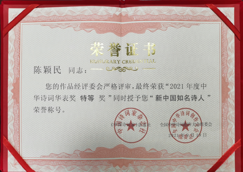 新洋:陳穎民榮獲“2021年度中華詩詞華表獎特等獎”