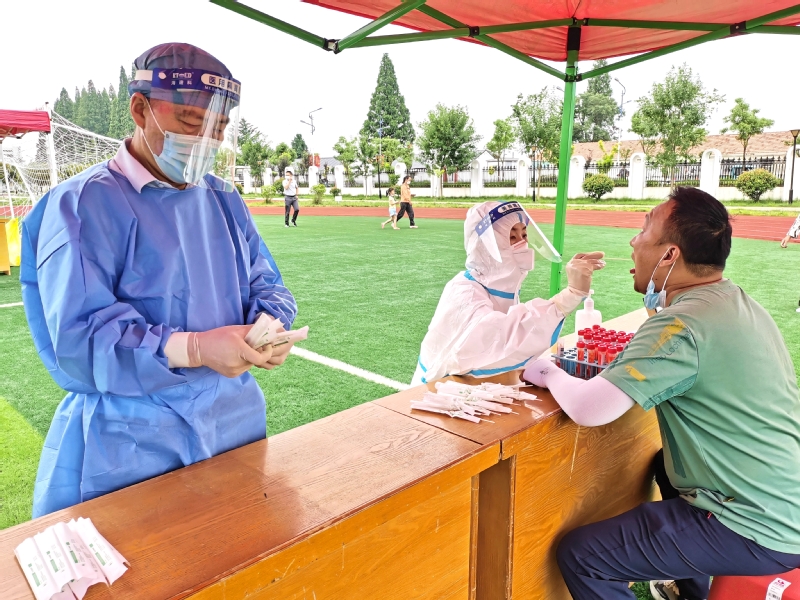 把廣場當(dāng)戰(zhàn)場,在團(tuán)結(jié)協(xié)作中恪盡職守。早晨五點(diǎn)半,居民們陸續(xù)趕來參加核酸檢測。只見徐加云一身藍(lán)色防護(hù)服,頭戴隔離面罩,手著橡膠手套,行色匆匆地忙碌在服務(wù)一線。指導(dǎo)掃碼、測量體溫、維持兩米線……看到需要引導(dǎo)的居民,他主動上前做起引導(dǎo)員;遇到腿腳不靈便的老人,他連忙攙扶做起志愿者;碰到哪個點(diǎn)位需要人手,他自愿加入做起服務(wù)員。溫度迅速攀升,衣服早已干了又濕,他卻毫不在意。拿起消毒噴壺,他仔細(xì)地為采樣臺、醫(yī)用垃圾箱、人員等候區(qū)等處消毒。為縮短居民等待時間,加快采樣速度,他提前為醫(yī)護(hù)人員準(zhǔn)備好核酸檢測咽拭子棉簽。“我是迎湖居委會工作人員,這些都是我應(yīng)該做的,更何況我還是一名共產(chǎn)黨員,全心全意為人民服務(wù)是我的職責(zé)。”當(dāng)被問到辛不辛苦時,他笑著回答道。歷時三小時十分鐘,迎湖廣場檢測點(diǎn)完成樣本采集1080份。核酸檢測高效率的背后,是徐加云的點(diǎn)滴付出,也是一個個共產(chǎn)黨員團(tuán)結(jié)協(xié)作的結(jié)果。