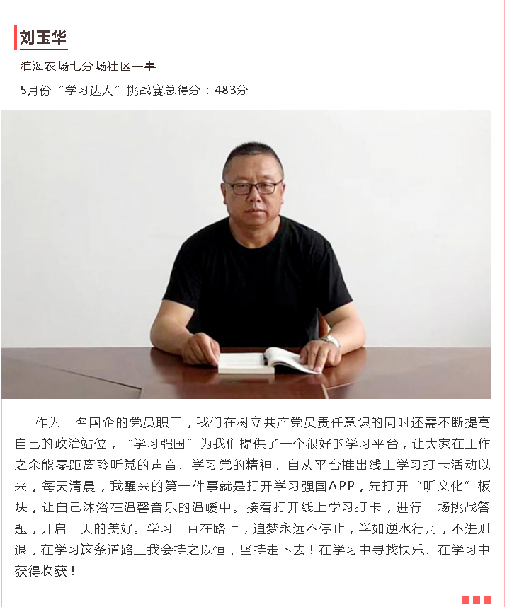 為充分展示“學(xué)習(xí)達(dá)人”風(fēng)采,根據(jù)射陽(yáng)縣“強(qiáng)國(guó)復(fù)興有我”群眾性主題宣傳教育活動(dòng)安排,射陽(yáng)宣傳推出“訪學(xué)習(xí)達(dá)人看家鄉(xiāng)變化”主題尋訪萬(wàn)里行活動(dòng)第一期,在全縣5月份最厲害的11名“學(xué)習(xí)達(dá)人”中,淮海的“學(xué)習(xí)達(dá)人”馮輝、陳祥、崔慧慧、劉玉華躋身其中,讓我們一起來(lái)聽(tīng)聽(tīng)淮海的“學(xué)習(xí)達(dá)人”們?cè)诠ぷ髦小⑸钌系?/span>心得感悟吧!圖為淮海學(xué)員“學(xué)習(xí)達(dá)人”們的心聲感悟。