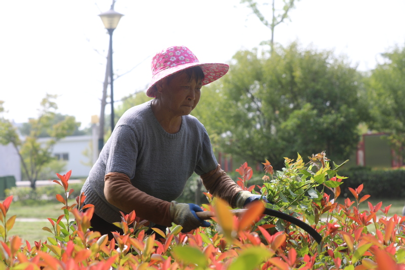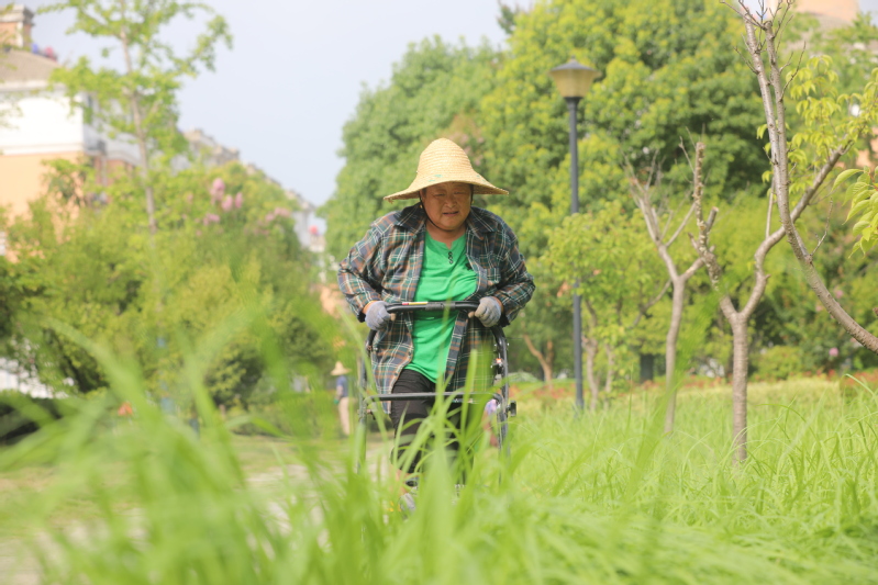 7月27日,寶應(yīng)湖農(nóng)場職工文化公園,7名工人正在為公園綠化除草。越是高溫雜草長得越旺。以席正英為隊長的綠化員們分工合作。草坪上用電動切草機(jī)清理,隨著“隆隆”的機(jī)聲,切碎的草屑在刀頭間飛濺,濺到了工人的身上、飛上了工人的臉龐,刺癢刺癢,淡淡的青草味洋溢在夏日的晨光里。綠化帶里,爬騰類的雜草枝枝蔓蔓,覆蓋的綠化樹上,工人們就用手先拉斷經(jīng)脈,再扯掉枝葉;低矮類的雜草擁擠在綠化樹間,工人們蹲下身子就用手拔、用刀割。當(dāng)天7名工人清理綠化300多平方米。