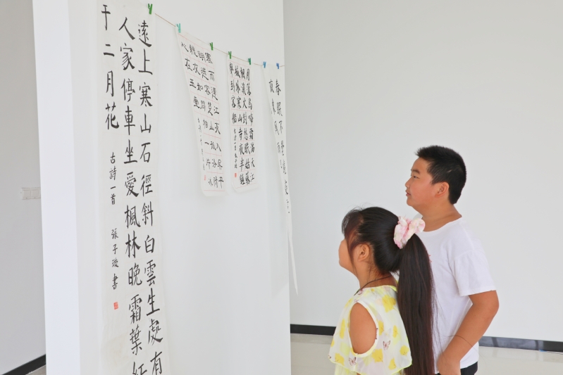 8月28日,在江心沙職工書(shū)屋二樓,一場(chǎng)為期一周,象征著收獲的青少年書(shū)法展,吸引了不少職工居民和學(xué)生前來(lái)觀覽。圖為“書(shū)迷”們觀摩“暑期公益課堂·書(shū)法班”“結(jié)業(yè)”作品的溫馨場(chǎng)景。