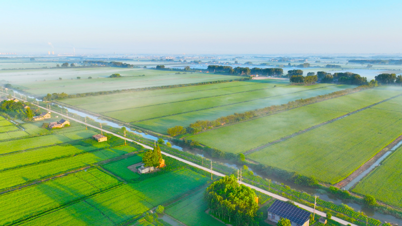 陽(yáng)光下,霧氣散,空氣中彌漫著清新的稻花香。俯瞰蔥綠的稻田,如一條條綠絲帶整齊排列。晶瑩的晨露凝結(jié)在青翠的秧苗上,猶如給稻田蒙上了一層剔透的面紗。剛抽出的稻穗上,有白色的稻花點(diǎn)點(diǎn),隨著稻穗一起隨風(fēng)輕舞飛揚(yáng)。小蜘蛛也趕來(lái)湊個(gè)熱鬧,在枝葉上織起了“秋的毛衣”。
