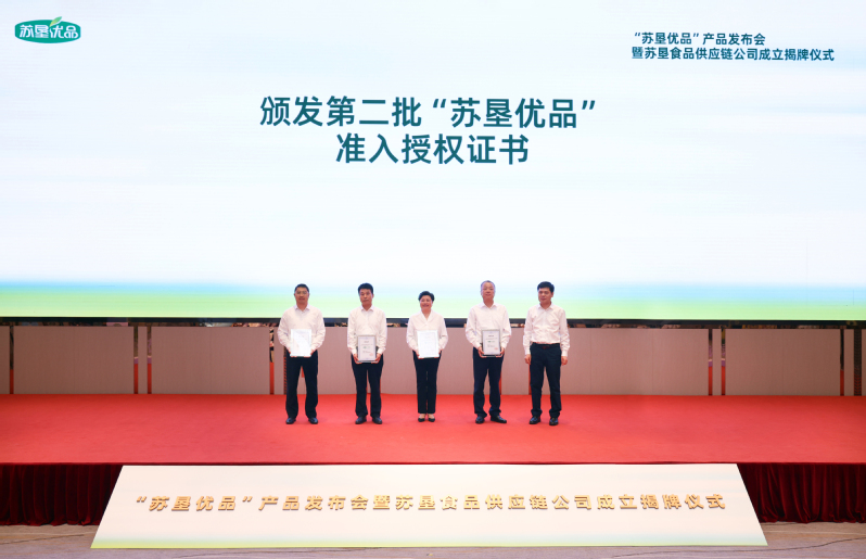 活動現(xiàn)場,吳本輝與中山大廈負責人共同為蘇墾食品供應鏈公司成立揭牌。朱浩為第二批“蘇墾優(yōu)品”生產單位頒發(fā)授權證書。王立新在致辭中系統(tǒng)闡述了“蘇墾優(yōu)品”產品的價值定位、市場定位和質量保障體系,并介紹了蘇墾食品供應鏈公司的組建背景與發(fā)展愿景。