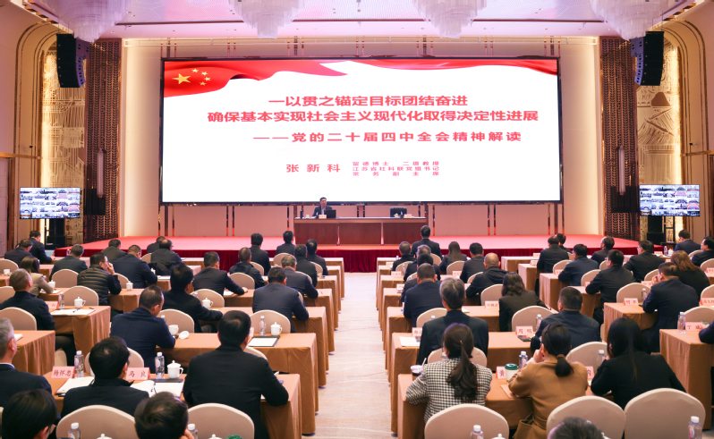 報告會上,張新科圍繞學(xué)習(xí)貫徹習(xí)近平總書記在黨的二十屆四中全會上的重要講話精神和全會《建議》,從深刻認(rèn)識黨的二十屆四中全會的重大意義,準(zhǔn)確把握“十五五”時期在基本實現(xiàn)社會主義現(xiàn)代化進(jìn)程中的重要地位,全面理解“十五五”時期經(jīng)濟社會發(fā)展的戰(zhàn)略任務(wù)和重大舉措等方面,結(jié)合我國經(jīng)濟社會發(fā)展實際情況,運用生動案例和翔實數(shù)據(jù),進(jìn)行了系統(tǒng)闡釋和全面解讀。他指出,全會取得的重大成果、作出的重大部署,充分體現(xiàn)了以習(xí)近平同志為核心的黨中央團結(jié)帶領(lǐng)全黨全國各族人民續(xù)寫經(jīng)濟快速發(fā)展和社會長期穩(wěn)定兩大奇跡新篇章、奮力開創(chuàng)中國式現(xiàn)代化建設(shè)新局面的歷史主動,必將對黨和國家事業(yè)發(fā)展產(chǎn)生重大而深遠(yuǎn)的影響。要把學(xué)習(xí)貫徹全會精神同學(xué)習(xí)領(lǐng)會習(xí)近平新時代中國特色社會主義思想貫通起來,結(jié)合習(xí)近平總書記對江蘇工作重要講話精神,做到學(xué)深悟透、狠抓落實,奮力譜寫“強富美高”新江蘇現(xiàn)代化建設(shè)新篇章。