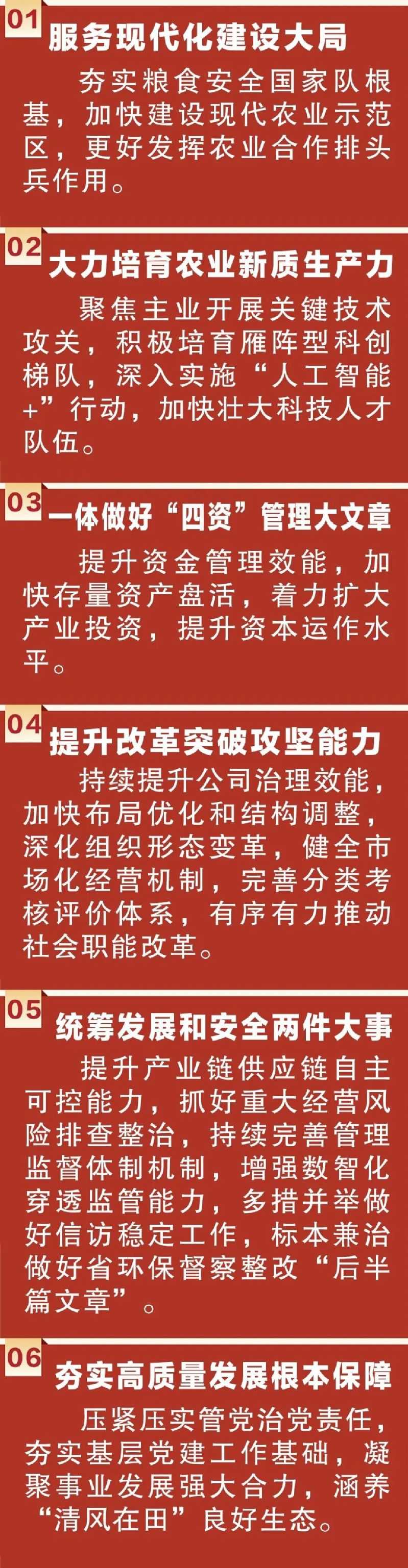 姜建友在報(bào)告中指出,2026年,要重點(diǎn)抓好十個(gè)方面工作任務(wù),全力優(yōu)存量、擴(kuò)增量、提質(zhì)量、防風(fēng)險(xiǎn),確保實(shí)現(xiàn)“十五五”開門紅、開門穩(wěn)。要毫不放松抓好糧食生產(chǎn),堅(jiān)持產(chǎn)量產(chǎn)能、生產(chǎn)生態(tài)、增產(chǎn)增收一起抓,促進(jìn)良田良種良機(jī)良法集成增效,協(xié)同推進(jìn)優(yōu)土、優(yōu)種、優(yōu)產(chǎn)、優(yōu)儲(chǔ)、優(yōu)銷“五優(yōu)聯(lián)動(dòng)”,著力提升糧食綜合生產(chǎn)能力。要做大做強(qiáng)農(nóng)業(yè)龍頭企業(yè),做強(qiáng)現(xiàn)代種業(yè),鞏固行業(yè)龍頭,提升農(nóng)場(chǎng)產(chǎn)業(yè),更好發(fā)揮引領(lǐng)帶動(dòng)作用。要鞏固壯大特色優(yōu)勢(shì)產(chǎn)業(yè),推動(dòng)產(chǎn)業(yè)重構(gòu)、技術(shù)升級(jí)、產(chǎn)品迭代和模式創(chuàng)新,鞏固壯大醫(yī)藥健康、城鄉(xiāng)建設(shè)服務(wù)、商貿(mào)服務(wù)產(chǎn)業(yè),為集團(tuán)高質(zhì)量發(fā)展提供支撐。要開放協(xié)同推進(jìn)科技創(chuàng)新,強(qiáng)化聯(lián)合創(chuàng)新,注重自主研發(fā),發(fā)展智慧農(nóng)業(yè),以科技創(chuàng)新塑造未來發(fā)展新優(yōu)勢(shì)。要堅(jiān)定不移深化國(guó)企改革,完善市場(chǎng)化機(jī)制,加快“兩非”“兩資”處置出清,深化辦社會(huì)職能改革,充分激發(fā)企業(yè)市場(chǎng)主體活力。要?jiǎng)?wù)實(shí)高效強(qiáng)化投資管理,以投資賦能產(chǎn)業(yè)升級(jí),多渠道挖掘投資標(biāo)的,加強(qiáng)項(xiàng)目全過程管理,為高質(zhì)量發(fā)展注入強(qiáng)勁動(dòng)能。要持之以恒加強(qiáng)品牌建設(shè),堅(jiān)持以價(jià)值提升為核心,統(tǒng)籌做好品牌管理、傳播推廣與產(chǎn)品運(yùn)營(yíng)。要積極穩(wěn)妥防范經(jīng)營(yíng)風(fēng)險(xiǎn),強(qiáng)化“兩金”管理,強(qiáng)化業(yè)財(cái)融合,強(qiáng)化“四位一體”,強(qiáng)化內(nèi)審防線,筑牢安全發(fā)展屏障。要盡心量力做好民生保障,用心做好民生實(shí)事,建強(qiáng)產(chǎn)業(yè)工人隊(duì)伍,深化文化文明創(chuàng)建,建設(shè)和美墾區(qū)。要堅(jiān)決維護(hù)安全穩(wěn)定大局,抓實(shí)安全生產(chǎn),做好信訪工作,抓牢生態(tài)環(huán)保,實(shí)現(xiàn)高質(zhì)量發(fā)展和高水平安全良性互動(dòng)。