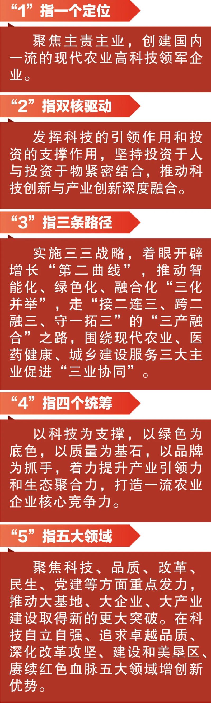 集團(tuán)“十五五”發(fā)展總體要求是:堅(jiān)持以習(xí)近平新時(shí)代中國(guó)特色社會(huì)主義思想為指導(dǎo),深入學(xué)習(xí)貫徹習(xí)近平總書記系列重要講話重要指示,尤其是關(guān)于江蘇工作、“三農(nóng)”工作、國(guó)企工作的重要論述,認(rèn)真落實(shí)省委省政府決策部署,扛牢“示范區(qū)、國(guó)家隊(duì)、排頭兵”的職責(zé)使命,緊扣“爭(zhēng)當(dāng)表率、爭(zhēng)做示范、走在前列”的總體目標(biāo),聚焦現(xiàn)代農(nóng)業(yè)、醫(yī)藥健康、城鄉(xiāng)建設(shè)服務(wù)主業(yè),堅(jiān)持“智能化、綠色化、融合化”發(fā)展方向,形成產(chǎn)業(yè)鏈縱向延伸、橫向拓展、產(chǎn)融結(jié)合、多元集成的發(fā)展格局,加快建設(shè)一流企業(yè),在“強(qiáng)富美高”新江蘇現(xiàn)代化建設(shè)中展現(xiàn)更大擔(dān)當(dāng)。