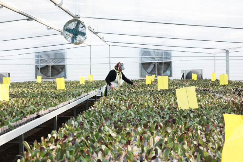 2月17日,云臺(tái)農(nóng)場(chǎng)興墾科技員工在整理啤酒花藤蔓(上圖)。2月17日,云臺(tái)農(nóng)場(chǎng)興墾科技工作人員在整理蝴蝶蘭育苗(下圖)。