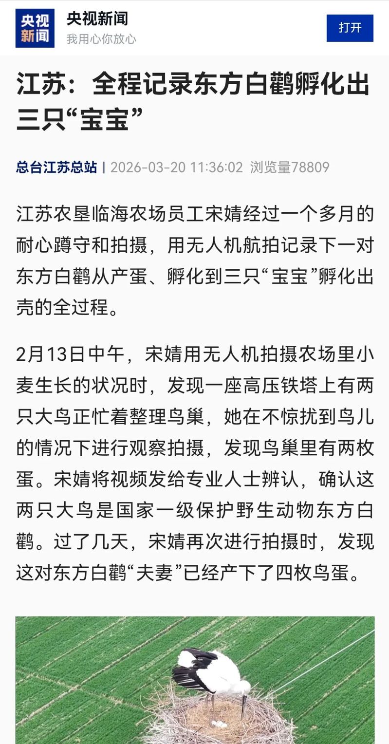 近日,中央電視臺CCTV-13《新聞直播間》、CCTV-2《正點(diǎn)財經(jīng)》、央視新聞客戶端、江蘇新聞等權(quán)威媒體持續(xù)關(guān)注臨海農(nóng)場—— 一對國家一級保護(hù)野生動物、被譽(yù)為“鳥中大熊貓”的東方白鸛,在此筑巢產(chǎn)卵并成功孵化雛鳥!無人機(jī)記錄下東方白鸛產(chǎn)卵、孵化、育雛的完整過程,畫面溫柔治愈,讓臨海農(nóng)場的生態(tài)之美強(qiáng)勢“出圈”。