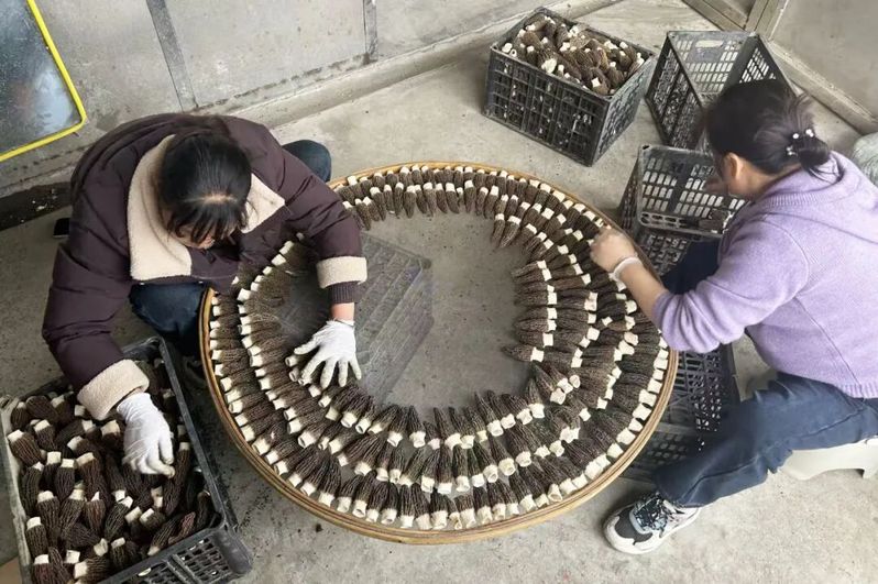 棚內(nèi)沒(méi)有片刻空閑,職工擺放好采收筐,手持專用小刀,彎腰穿梭在菌壟之間,動(dòng)作嫻熟又輕柔。他們精準(zhǔn)挑選達(dá)到采收標(biāo)準(zhǔn)的成熟菌菇,輕輕下刀割下菌柄,隨后仔細(xì)清理根部泥土、修剪多余雜質(zhì),再按照品相大小分級(jí)入筐,指尖翻飛間,一筐筐鮮嫩的羊肚菌陸續(xù)碼放整齊,現(xiàn)場(chǎng)采收節(jié)奏緊湊、井然有序。