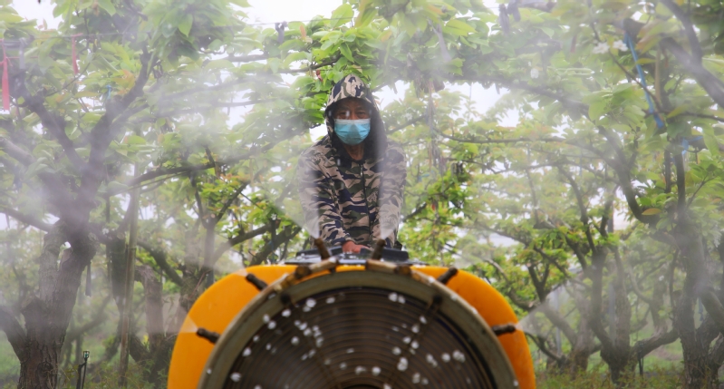 4月11日,在江蘇省南通市海門區(qū)的江蘇農(nóng)墾江心沙農(nóng)場,果農(nóng)針對當(dāng)前幼蟲體群集、裸露、不耐藥,病菌初侵染,葉片尚小等特性,搶抓防治最佳時機(jī),操作自走式噴霧機(jī)在梨園里往返穿梭進(jìn)行噴防作業(yè)。
