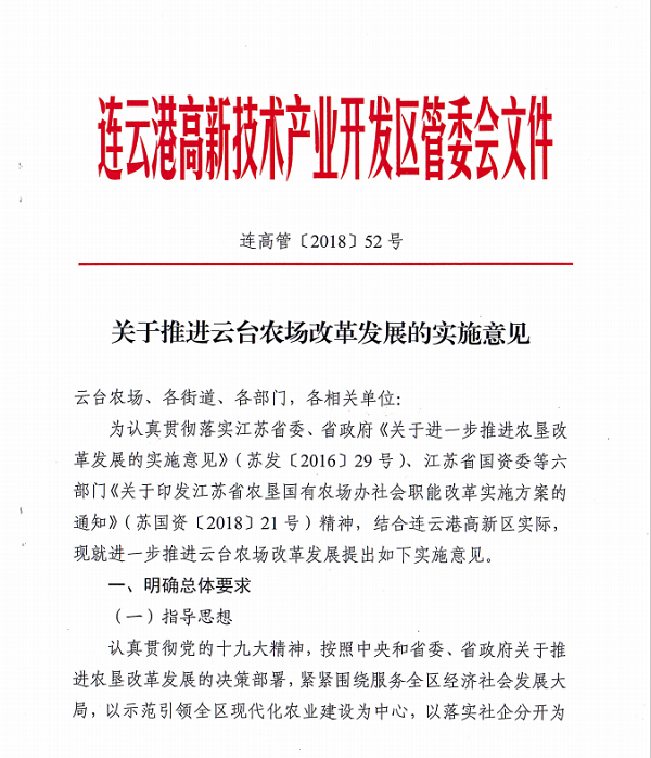 連云港高新區正式出臺《關于推進云臺農場改革發展的實施意見》