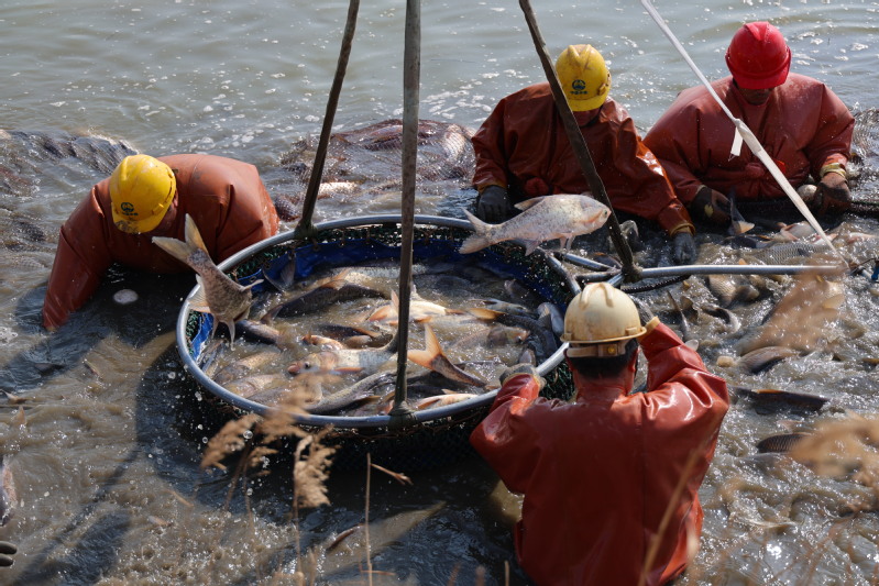近期,崗埠農(nóng)場小島山養(yǎng)殖基地迎來鮮魚豐收季。千畝水產(chǎn)養(yǎng)殖基地上一片繁忙景象,十余名捕魚工人正緊密配合,熟練地進(jìn)行著拉網(wǎng)作業(yè),一條條鮮活的鯉魚、鰱魚紛紛躍出水面,水花不斷翻騰,奏響了冬日的豐收樂章。