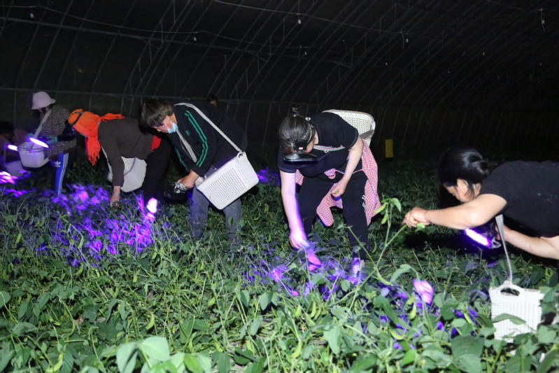 5月12日夜間,在崗埠農(nóng)場高效農(nóng)業(yè)示范園一處豆丹養(yǎng)殖基地,工作人員利用紫光燈在黑夜里收獲豆丹成蟲。當(dāng)前正是豆丹大量上市的時節(jié),當(dāng)?shù)負屪マr(nóng)時,加緊收獲豆丹成蟲供應(yīng)市場。