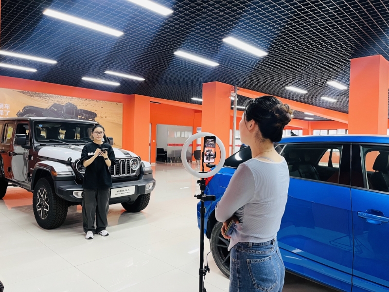 “牧馬人原廠配備全地形255 75R18輪胎、中控觸摸屏由8寸升級到12寸、涉水深度達760mm。”蘇舜錦尚公司(Jeep4S店)主播陳佳琪正通過直播間為客戶360°全方位展示和講解車輛配置,她耐心地解答客戶問題,1名客戶已成功預(yù)約進店。
