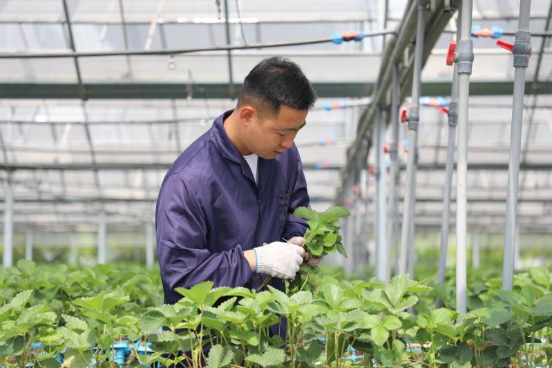 當(dāng)前正值草莓苗生長的關(guān)鍵期,在三河農(nóng)場科技園區(qū)草莓高架大棚內(nèi),工作人員正在打草莓老葉并檢查草莓苗的生長情況,以便及時預(yù)防赤霉病、炭疽病等各種病蟲害。