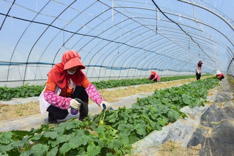 走進淮海農(nóng)場高效種植園,大棚內(nèi)一株株青翠欲滴的甜瓜苗郁郁蔥蔥,一朵朵黃燦燦的小花競相綻放、長勢喜人。目前正值授粉關(guān)鍵期,工人們在棚內(nèi)來回穿梭,精心授粉,為今年的豐收打好基礎(chǔ)。據(jù)了解,農(nóng)場采用“羊肚菌+甜瓜”的輪作模式,利用種植菌菇改良后的土壤栽種甜瓜,達到提升甜瓜品質(zhì),一棚兩收、激活土地效益的目的。