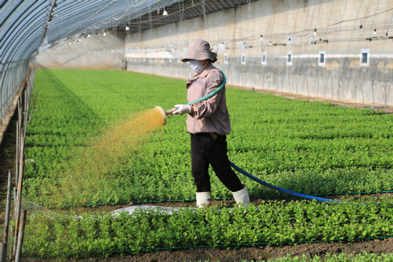 2024年11月26日,江蘇省連云港市海州區的江蘇農墾崗埠農場,工作人員在大棚里為菊花苗施撒水溶肥,調節土壤酸堿度,活化土壤,促進菊花生根生長。