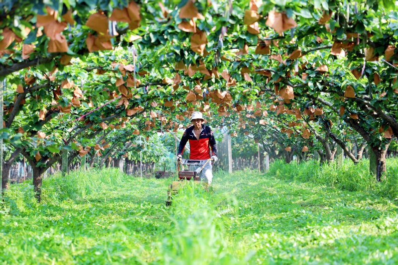 7月3日,在江心沙農場生態梨園,果農忙著操控手扶式割草機進行夏季除草和環境清理工作,為月底開園大面積采摘供應市場做好準備工作。