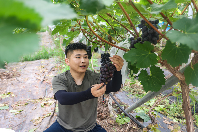 盛夏七月,正是葡萄掛滿枝頭的季節,云臺農場云水灣濕地公園葡萄采摘園的葡萄迎來豐收,吸引眾多游客前來體驗采摘樂趣。走進葡萄采摘園,濃烈的果香沁人心脾,翠綠的葡萄葉下,一串串顆粒飽滿的葡萄掛滿藤蔓間,十分誘人,工作人員正忙著將葡萄采摘、裝箱,一派繁忙火熱的景象。看到農場銷售人員微信朋友圈發布葡萄成熟的消息,游客張女士迫不及待地前來采摘。入園后不到半小時,她就摘了滿滿兩筐紫色的葡萄,她笑著說:“這里的葡萄很甜,每一串都特別好吃,不小心就摘多了。”據悉,云臺農場云水灣濕地公園葡萄采摘園的葡萄早晚熟品種搭配種植,匯集巨峰、夏黑、紅寶石、金手指、陽光玫瑰等20多個品種,目前上市的是夏黑、紅巴拉多品種,采摘期從7月中旬開始,可持續到9月底。“云臺葡萄除了有‘國家綠色食品認證’,還被納入《綠色食品標識使用典范(2023)》,2023年還榮獲最美優質農產品(葡萄)企業獎,甜度、口感都是上上佳品。每年我們還會舉辦葡萄采摘節、青少年研學拓展、品秋賞味等活動,讓‘采摘游’成為云臺農場的特色亮點。”云水灣常務副總經理卜馳龍說。