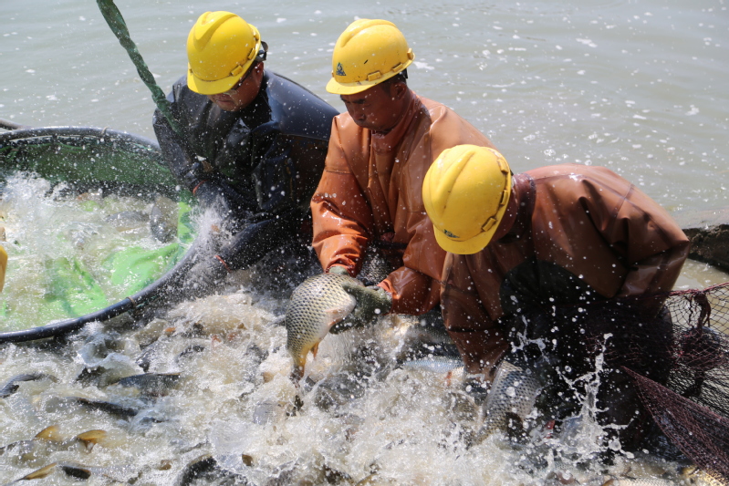 入夏以來,崗埠迎來水產品捕撈銷售的黃金季節。7月4日一大早,崗埠農場公司北漁場的養殖塘口便響起了“起網”的號子聲,隨著工人們相互配合,一起發力將巨型漁網緩緩收攏,一條條活蹦亂跳的大魚出現在人們的視野中,平靜的水面上也頓時水花飛濺,大魚歡快地躍出水面,一片人歡魚躍的豐收景象。“2024年上半年,養殖中心緊跟市場行情,連續開展捕魚銷售作業,爭取效益最大化。”在捕撈現場,中心負責人單懷亞一邊指揮分揀水產品,一邊介紹。養殖中心充分發揮“淮河牌”水產品品牌優勢和無公害水產品養殖規模化、標準化、高效化的優勢,促進水產養殖健康發展。今年以來,水產公司加快調整養殖模式,優化養殖結構,采取“輪捕輪放,按需銷售”管理模式,準確把握市場行情,確保全年都有鮮魚上市。“每年這個時候是水產銷售旺季,近期北漁場和南漁場將先后進行水產捕撈銷售。我們時刻關注市場動向,爭取銷售效益最大化。”單懷亞表示,養殖中心積極對接市場,努力提高水產銷售效益。據悉,夏季捕撈的魚獲以鯉魚、花鰱、白鰱為主,最重的鰱魚有15斤以上。僅7月4日當天,捕撈銷售水產品28000斤,銷售額14萬元。下一步,養殖中心將繼續利用好水資源優勢,結合產業發