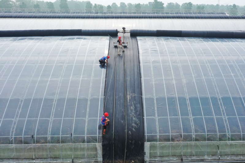 近日,崗埠農場高效農業示范園陸續進入空茬期。為進一步提升生產質效,園區組織專業維修隊伍,對溫室大棚進行保養維修,更換易損件,對相關設備進行檢修,確保下半年種植經營工作順利推進。圖為維修工人正在更換28*320型大棚的保溫棉。