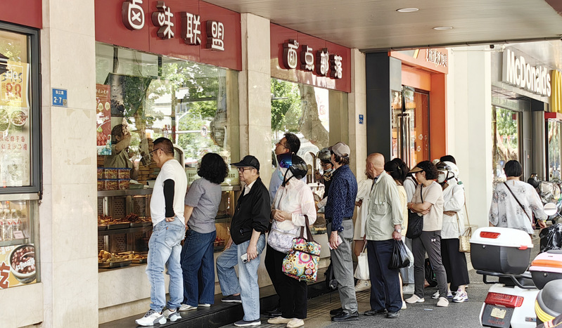 中山大廈傳承老南京口味,外賣窗口每天提供鹽水鴨、青團等20多個菜品,受到廣大賓客的追捧。1-5月份,外賣窗口實現營收342.72萬元,較去年同期增長6.5%。圖為賓客排隊購買。