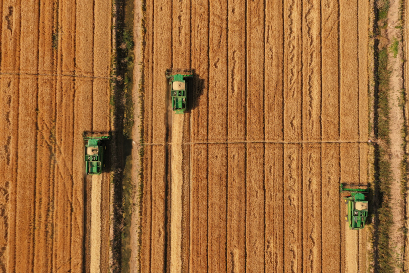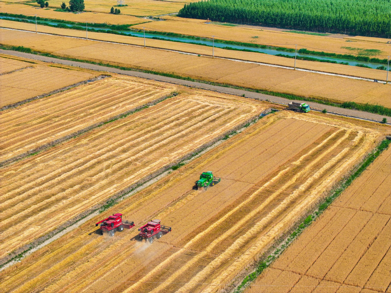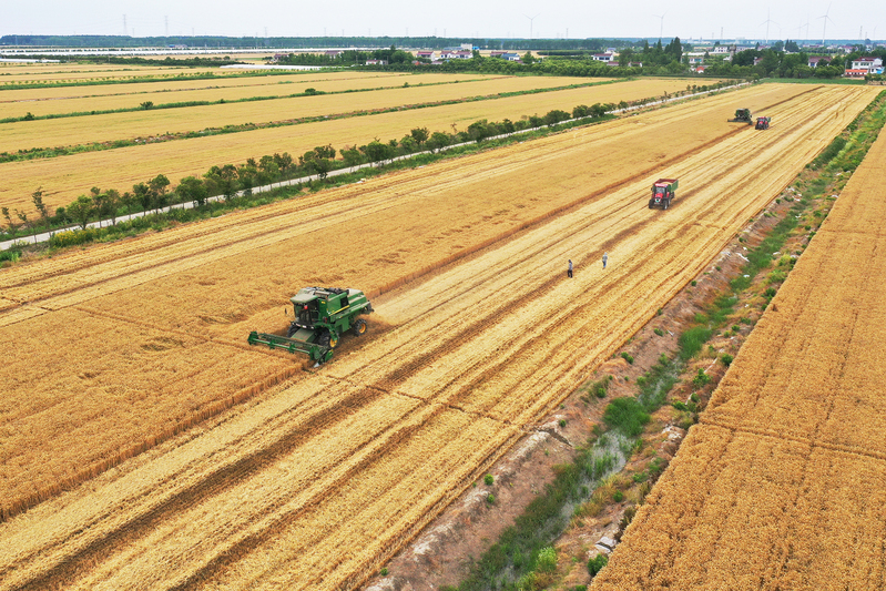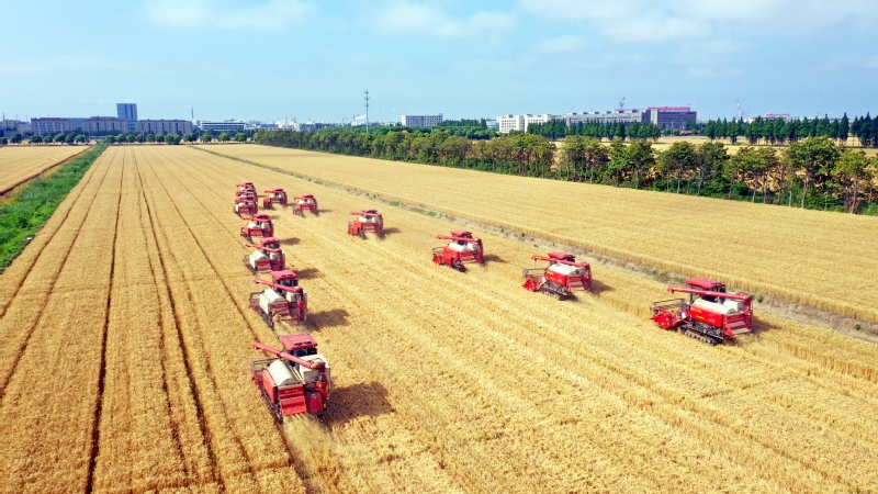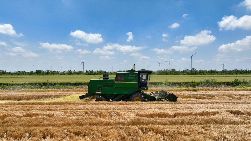 5月28日,蘇墾農發南通分公司大安村基地搶抓晴好天氣,收割成熟小麥,確保顆粒歸倉。