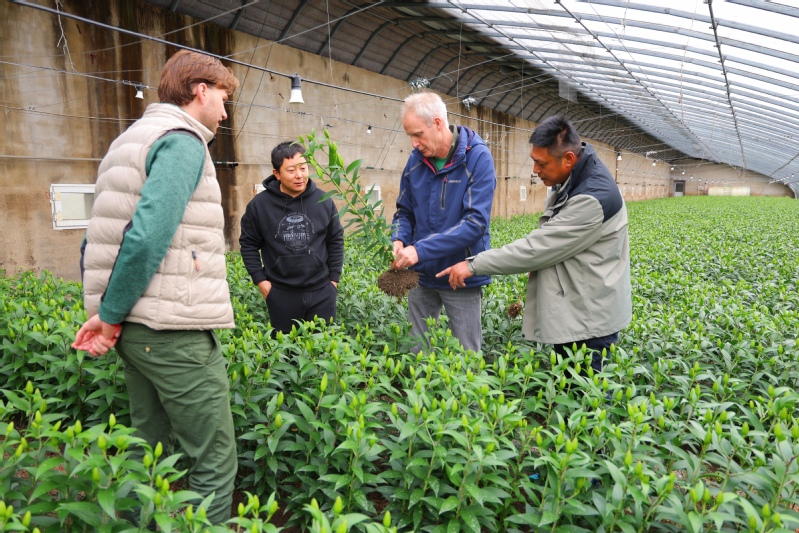11月23日,荷蘭簡懷特公司資深花卉專家一行走進崗埠農(nóng)場高效農(nóng)業(yè)示范園,深入百合花種植基地,現(xiàn)場指導園區(qū)百合花種植管理工作。