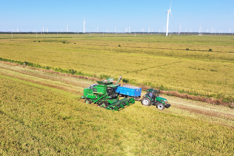 10月10日,江心沙農(nóng)場100余畝“低GI”功能性水稻喜迎豐收,農(nóng)機(jī)手駕駛收割機(jī)、運(yùn)糧車來回穿梭,密切配合,確保顆粒歸倉。