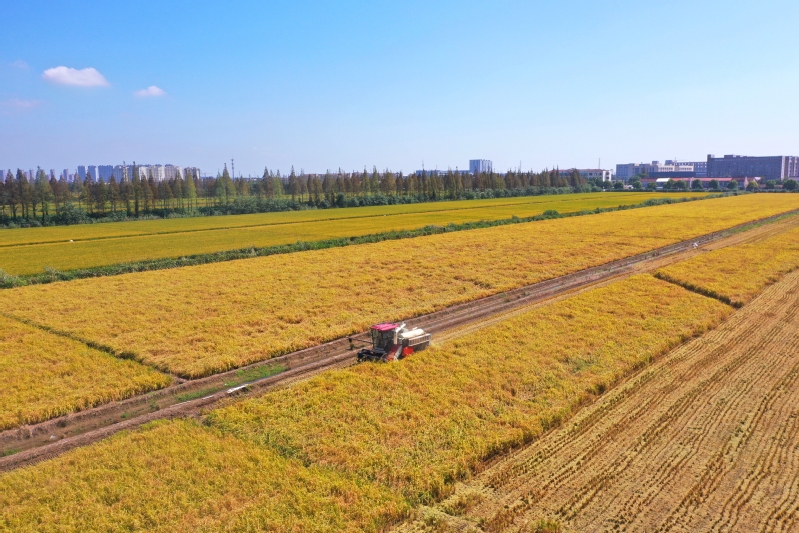10月9日,臨海農(nóng)場的稻田里機(jī)聲轟鳴,1000畝早熟水稻品種“武育粳702”首塊田正式開鐮收割。