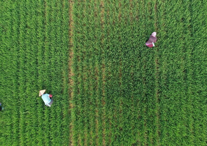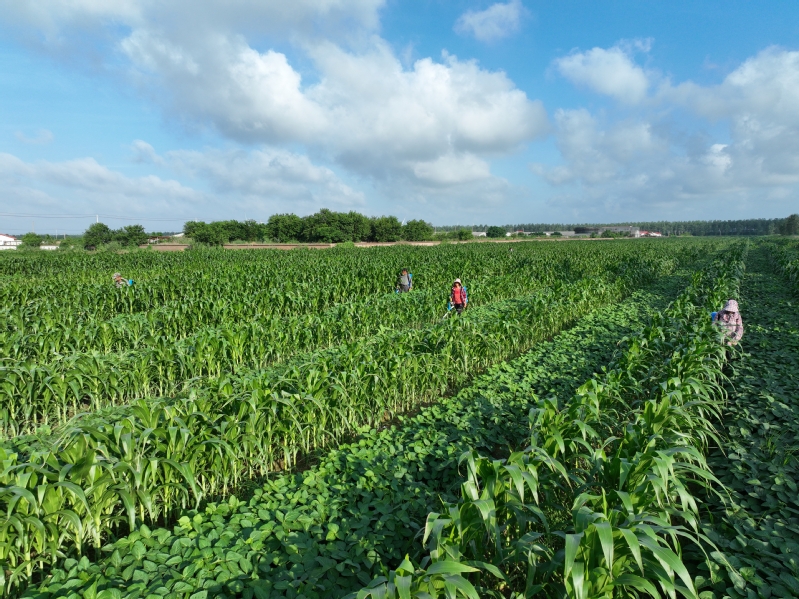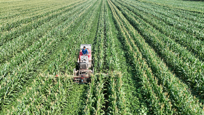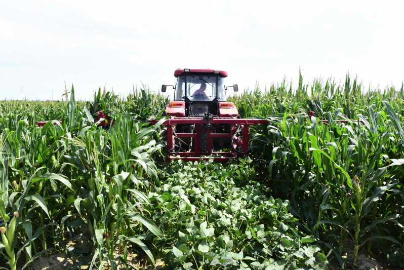 玉米雄穗剛露頭尚未開花散粉時進(jìn)行去頂(去掉玉米雄穗),既能讓玉米提前成熟3-5天,又可以使玉米籽粒灌漿相對集中、減少養(yǎng)分消耗,可以降低株高防風(fēng)防倒,改善玉米基部及行間大豆光照積累,減少穗部易患玉米螟、蚜蟲等害蟲的危害,從而達(dá)到增產(chǎn)的目的。蘇墾農(nóng)發(fā)淮海分公司通過引進(jìn)2臺玉米切頂機(jī),對5000多畝玉米大豆帶狀復(fù)合種植田間的玉米雄穗進(jìn)行切頂作業(yè),據(jù)悉,每臺機(jī)械每天可以作業(yè)200畝,極大地提升了工作效率。圖為8月16日,淮海分公司運(yùn)用大機(jī)械在玉米大豆帶狀復(fù)合種植田間對玉米雄穗進(jìn)行切頂作業(yè)。